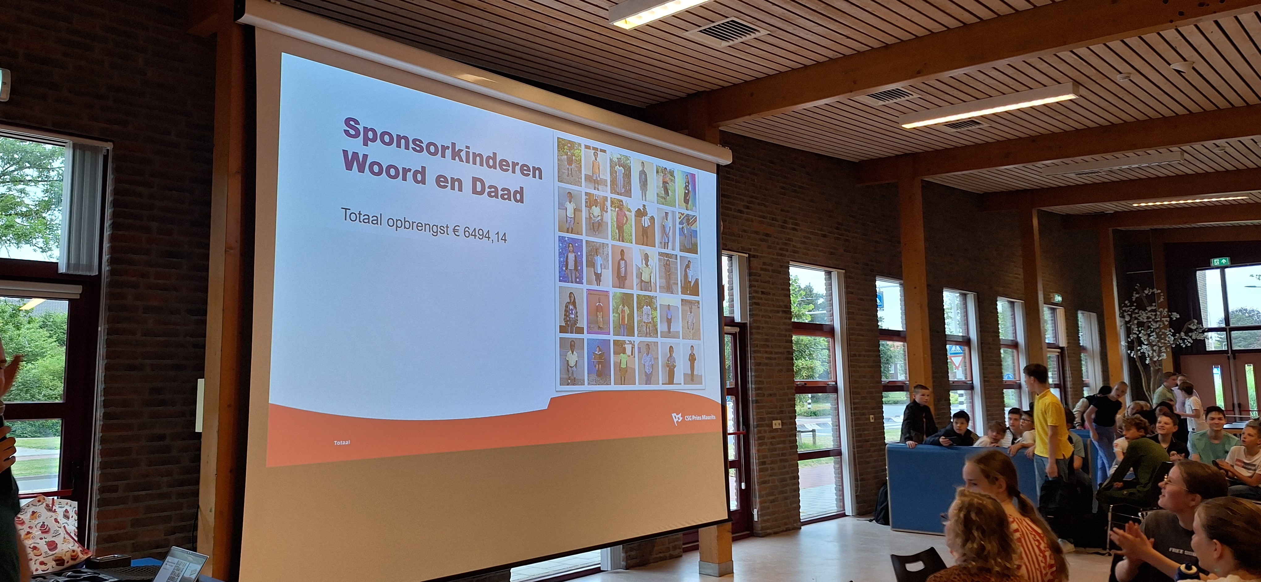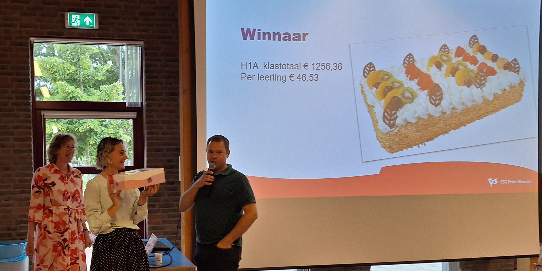 Leerlingen uit klas 1 hebben zich op allerlei manieren ingezet voor de dertig sponsorkindjes van Woord & Daad die de CSG Prins Maurits rijk is. Per klas werd er een actie opgezet. Het totaal opgehaalde bedrag is maar liefst €6.494,14 euro. Klas H1A was overduidelijk de winnaar. Deze klas haalde €1.256,36 op, dat is ruim €46,- per leerling. Deze klas kreeg een heerlijke taart als beloning.