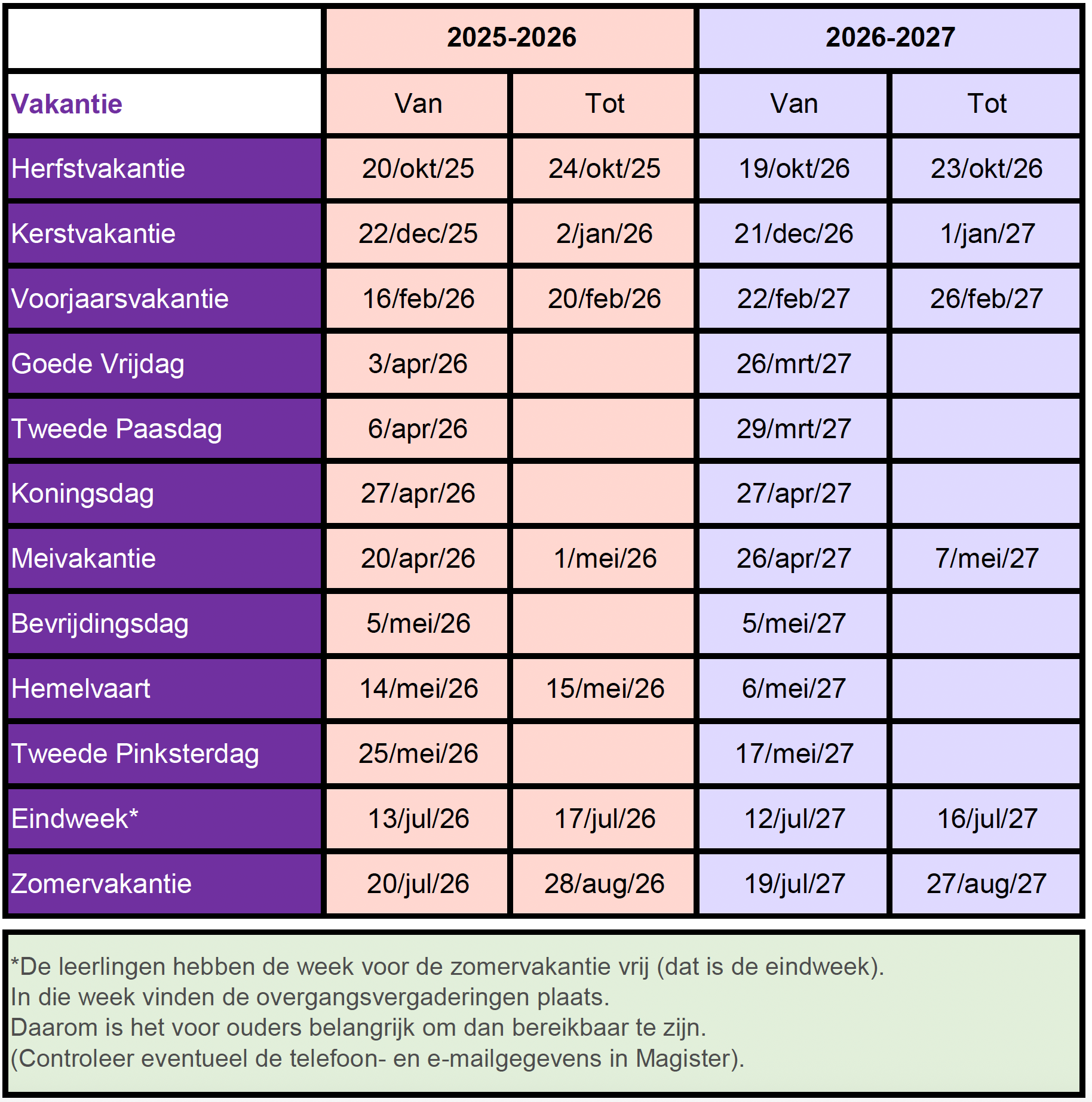 Een overzicht van de vakanties voor schooljaar 2025-2026 en schooljaar 2026-2027 is te vinden via onderstaande button.